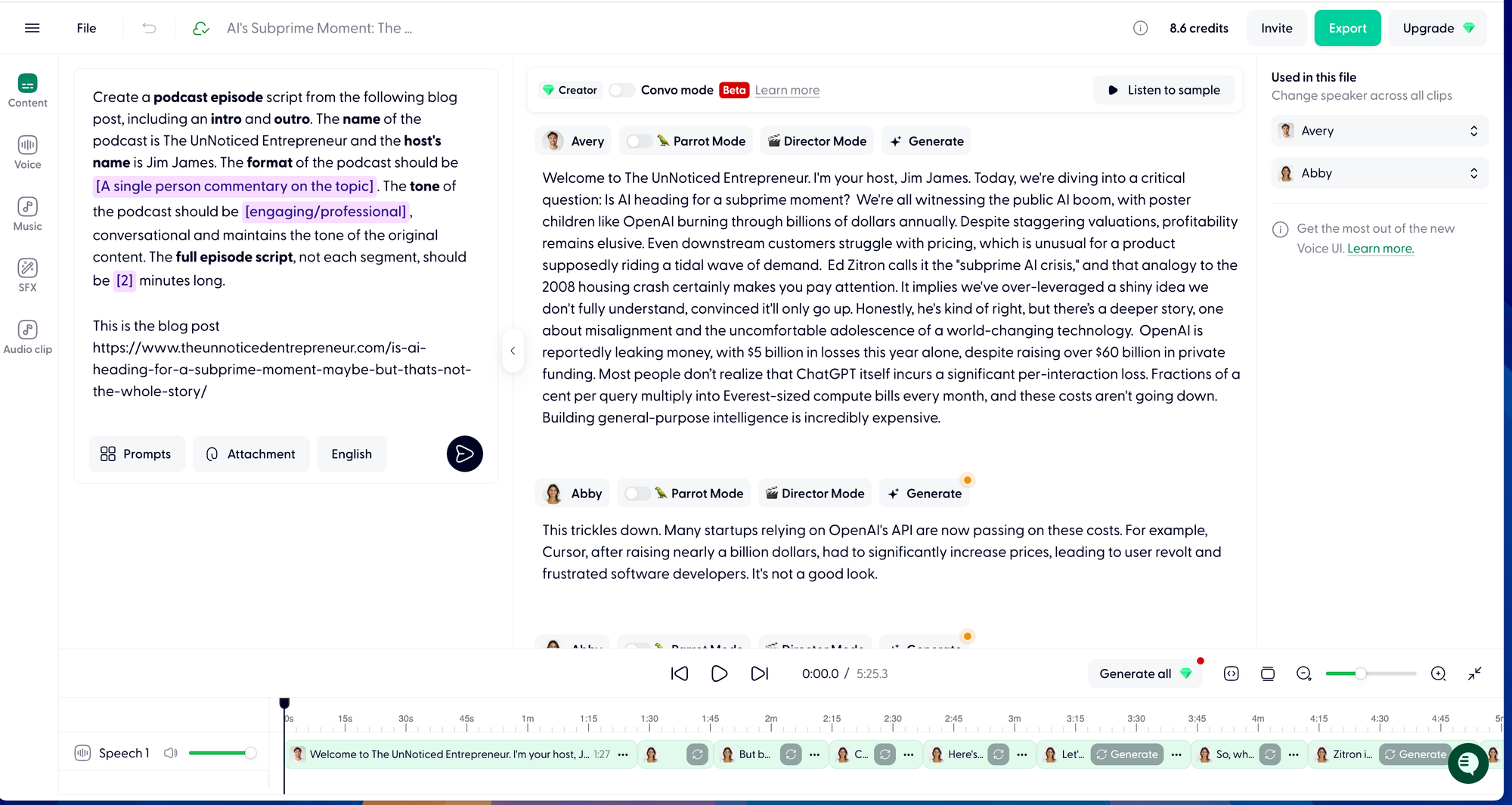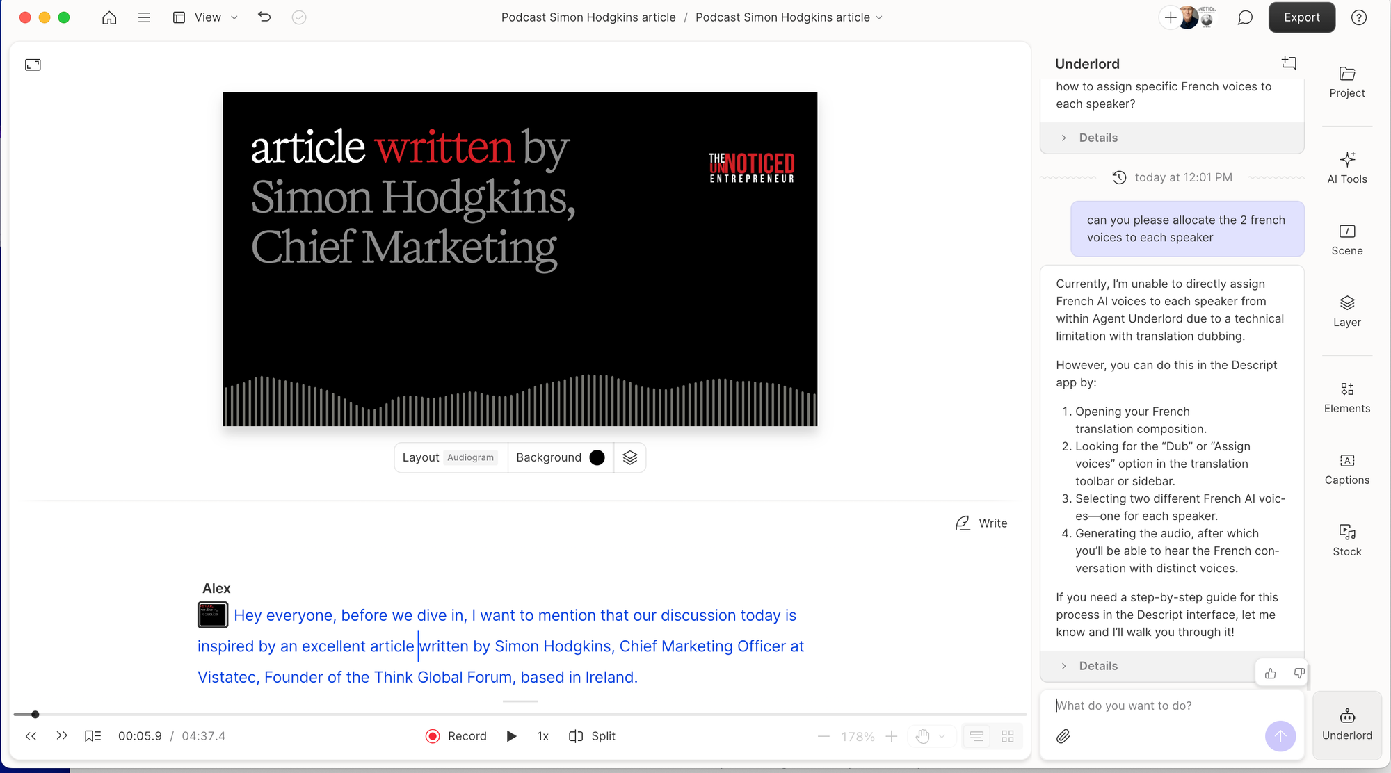 Descript. Using underlord, the agentic ai within the platform, the whole process took less than 60 minutes.This was done with explanations of what I wanted e.g. thank Simon for being the inspiration for the article.The long form article became a 4 minute mini podcast in less than 30 minutes. Listen for the cadence, the interaction, the timing...