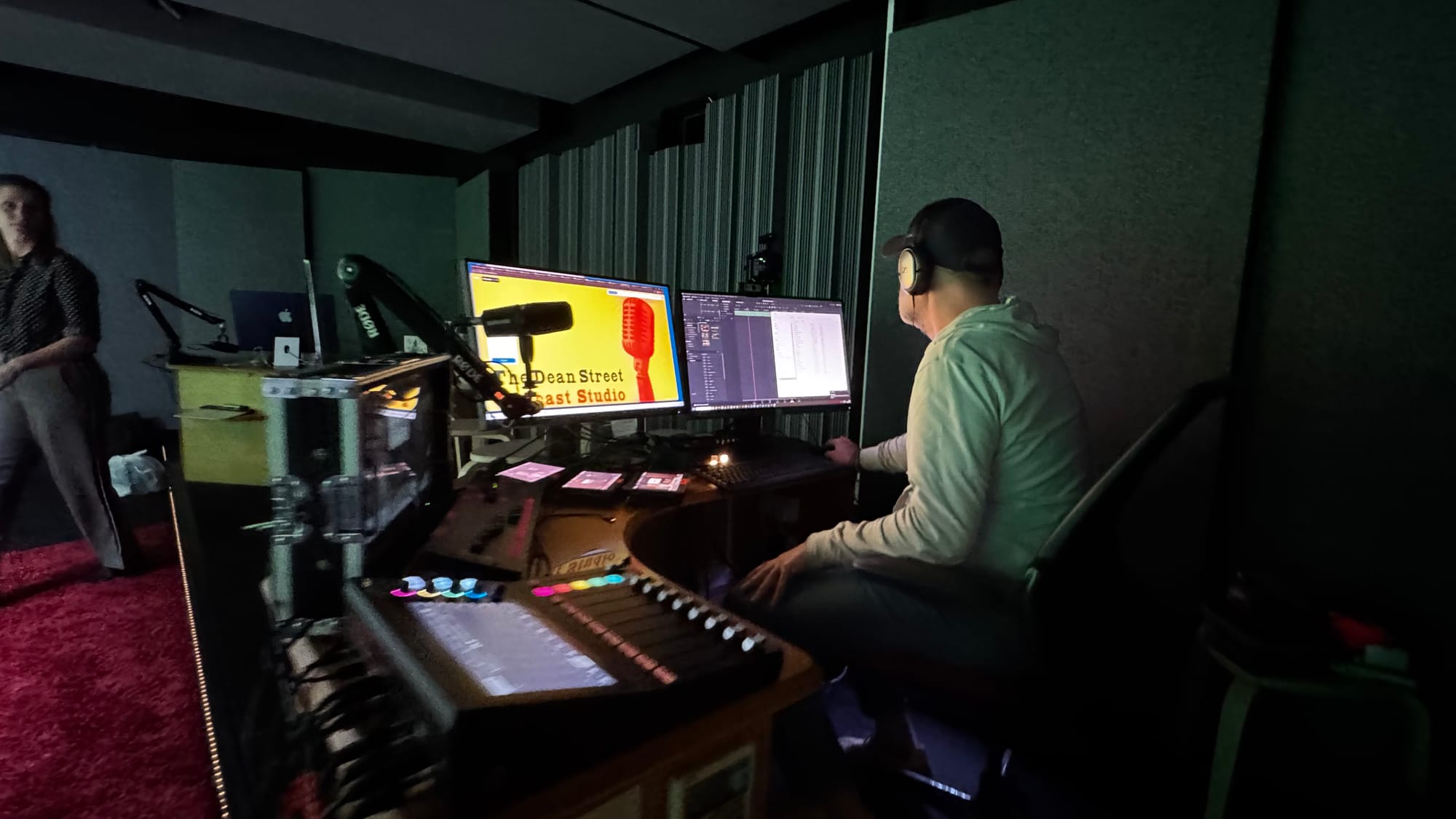 Rob Chandler, the producer, manages the recording taking place with the 2 guest mics and 3 cameras.
