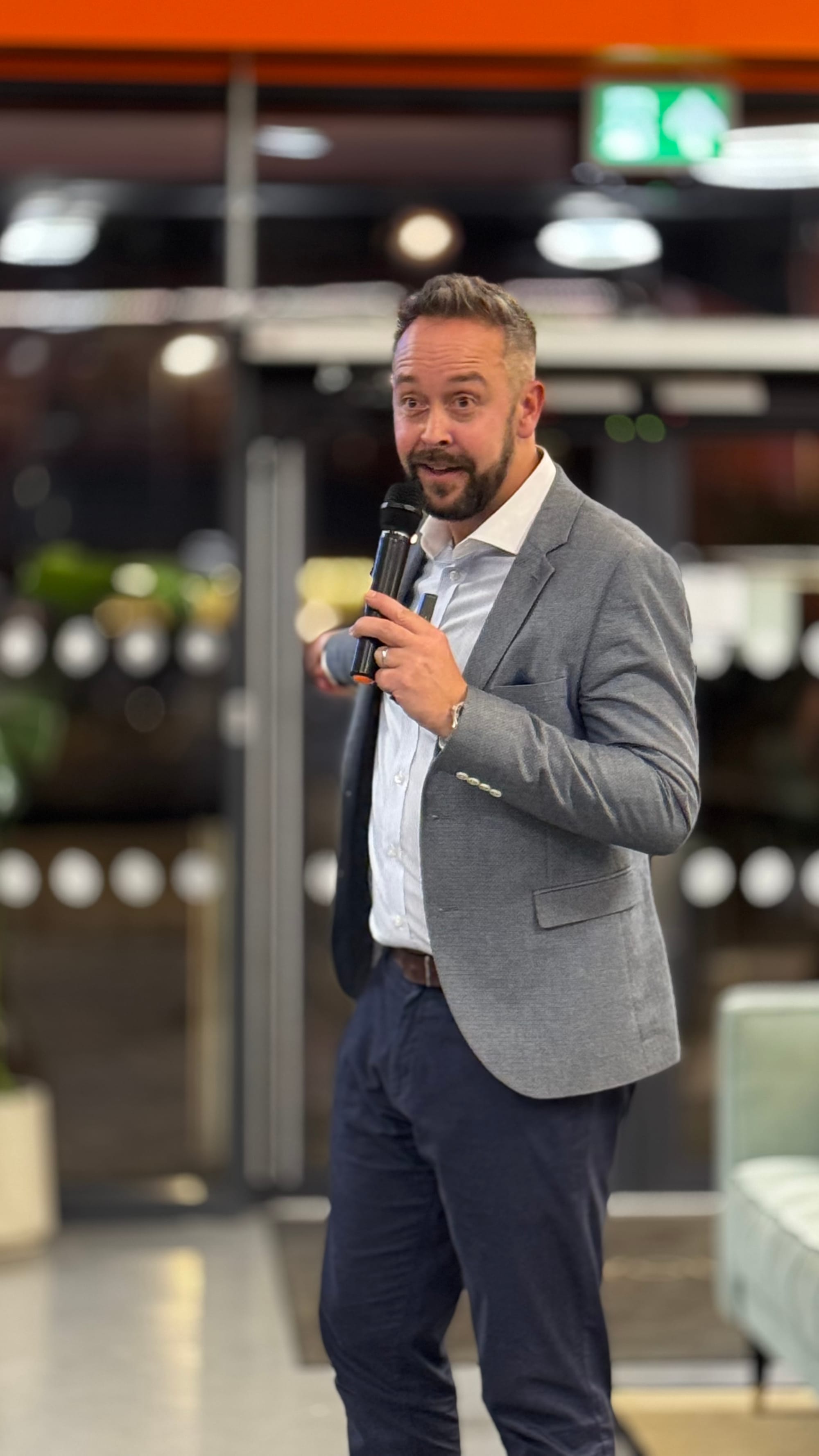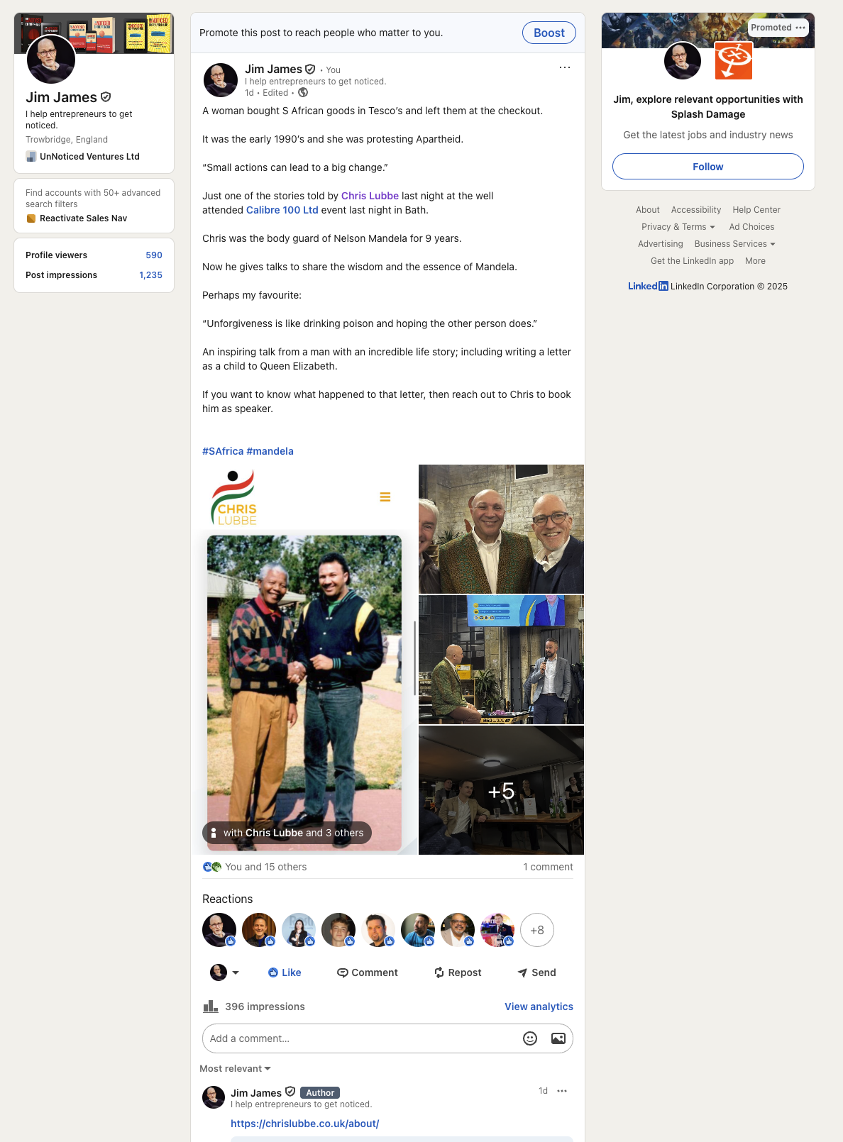 Chris mentioned at the end of the event that he wants to start a podcast. In which case, promoting him on LinkedIn is a great way to show good will and to start a relationship by giving first.