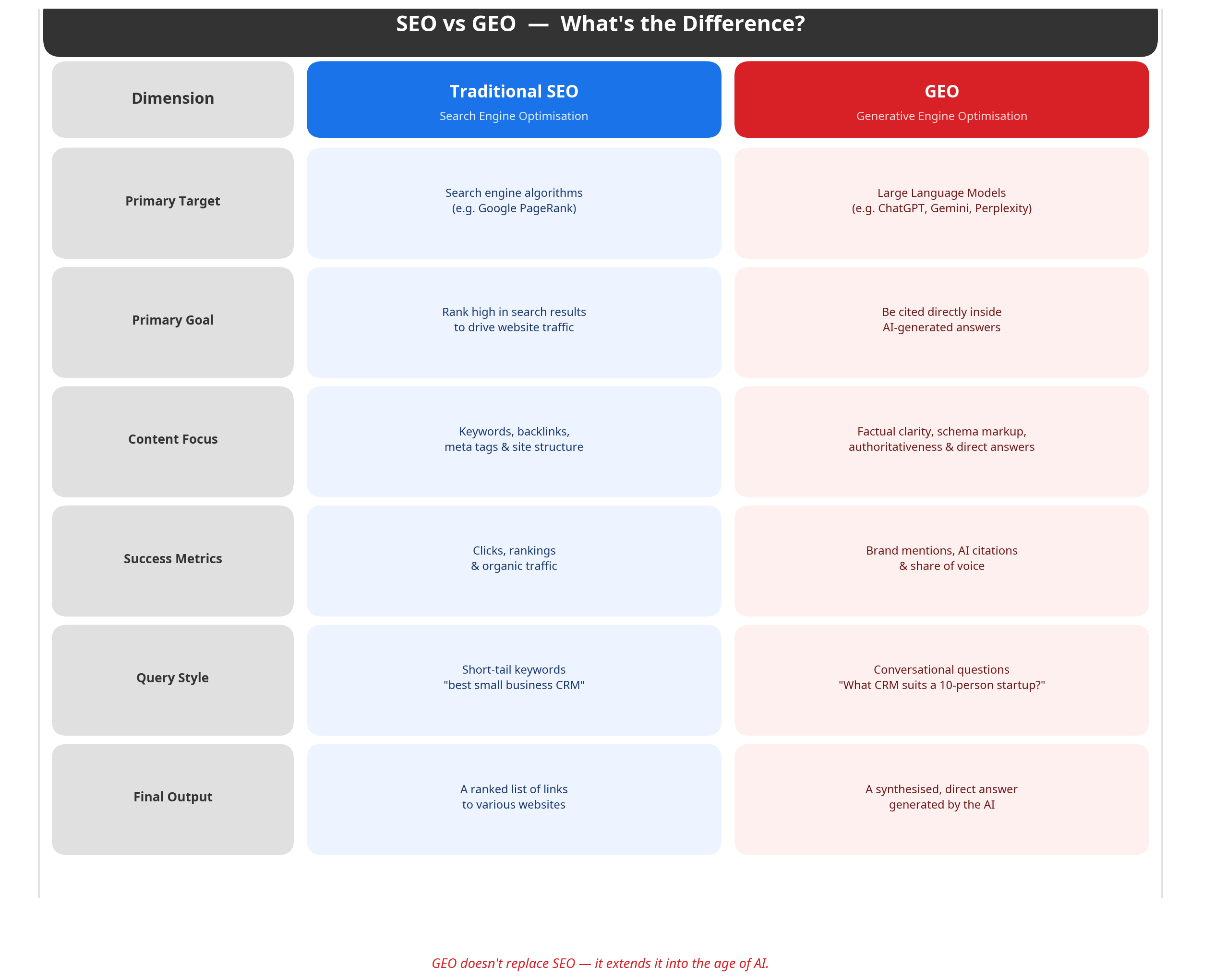 The transition from an SEO-centric to a GEO-aware strategy represents a fundamental change in how we approach digital content. While the two are not mutually exclusive and share foundational principles of quality and authority, their objectives and tactics differ significantly. Understanding these differences is the first step for any entrepreneur looking to adapt.